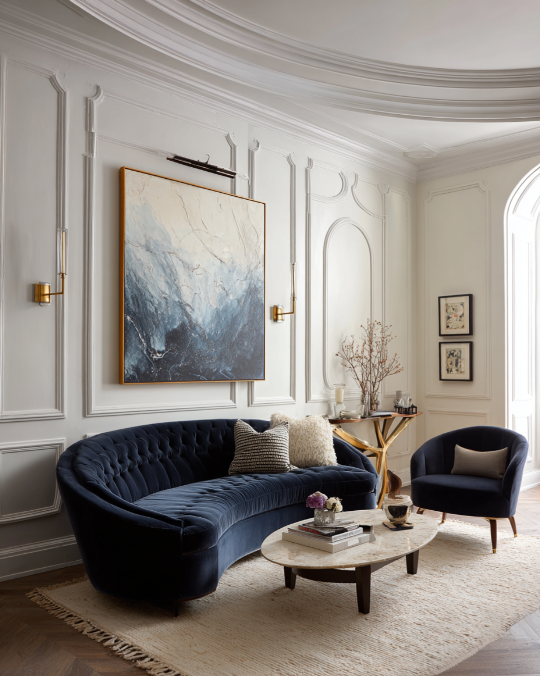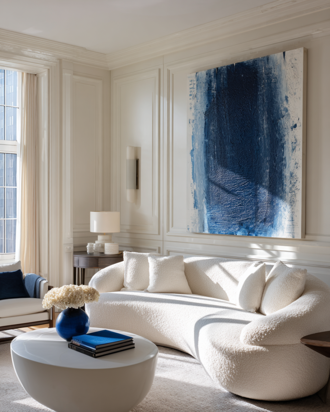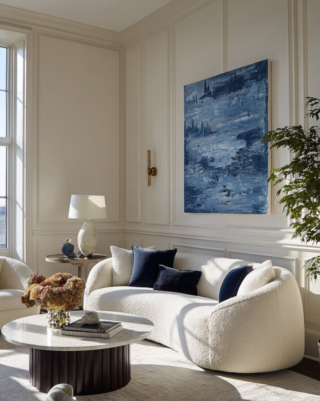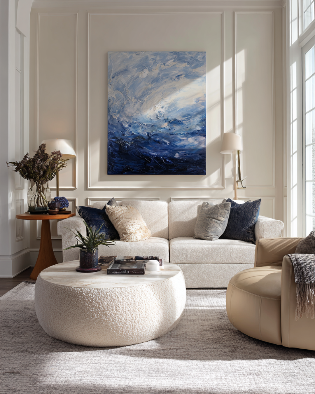 A well-placed blue painting naturally becomes the focal point of a room. In neutral interiors—think creams, ivories, and soft beiges—it introduces contrast without overwhelming the palette. The eye is drawn to the artwork, allowing it to anchor the surrounding furniture and décor.