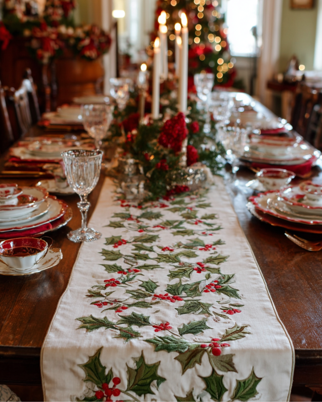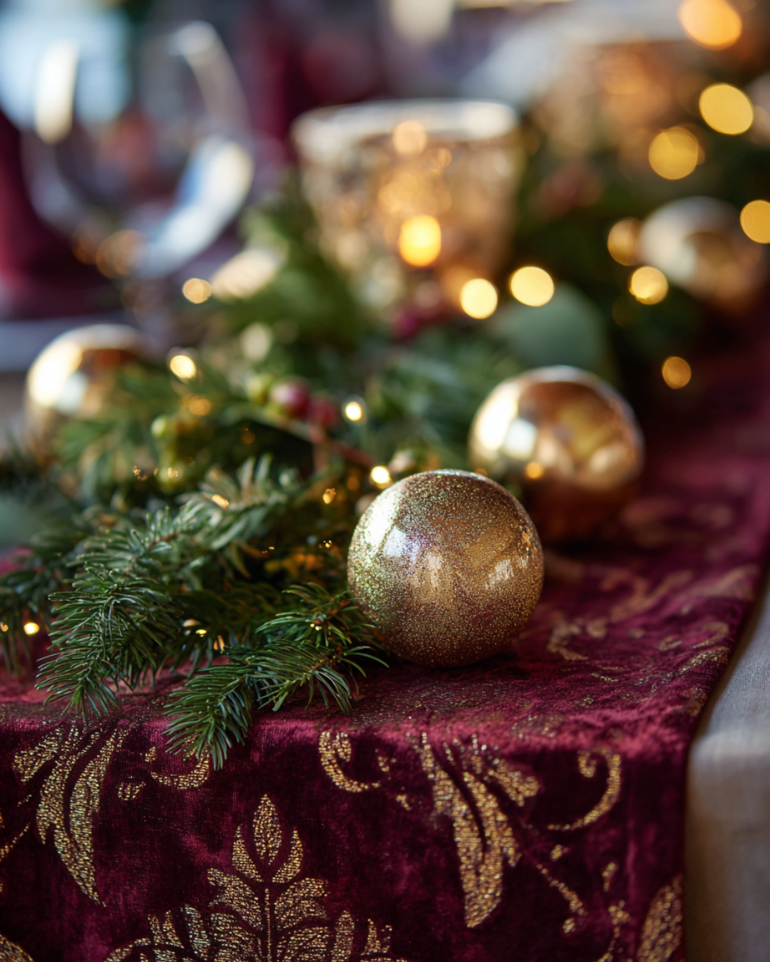 A festive table runner instantly anchors the entire setting. Deep burgundy, embroidered holly, or subtle gold detailing adds warmth and texture while keeping the table feeling refined. Choose fabrics like linen or velvet to create a layered, luxurious look without overwhelming the space.