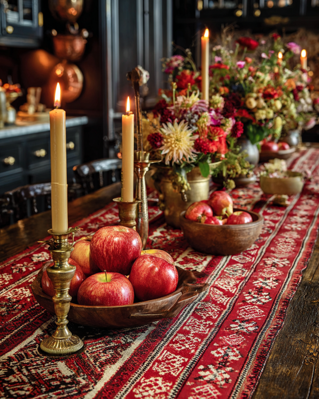Nothing sets a holiday mood quite like candlelight. Taper candles in deep red or ivory, paired with brass or gold holders, create a soft, inviting glow. Keep centrepieces low so conversation flows easily across the table while still enjoying that cosy, intimate ambiance.