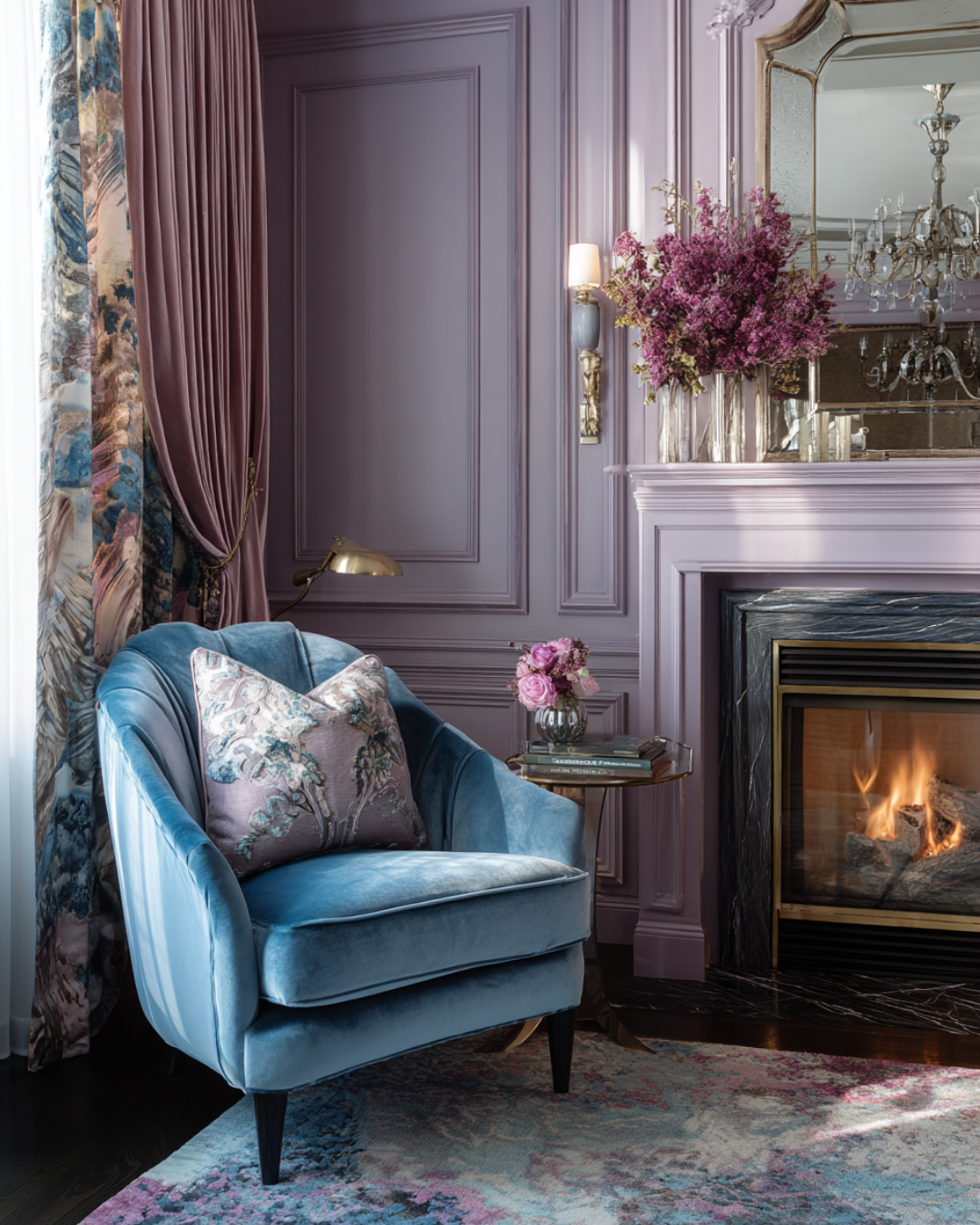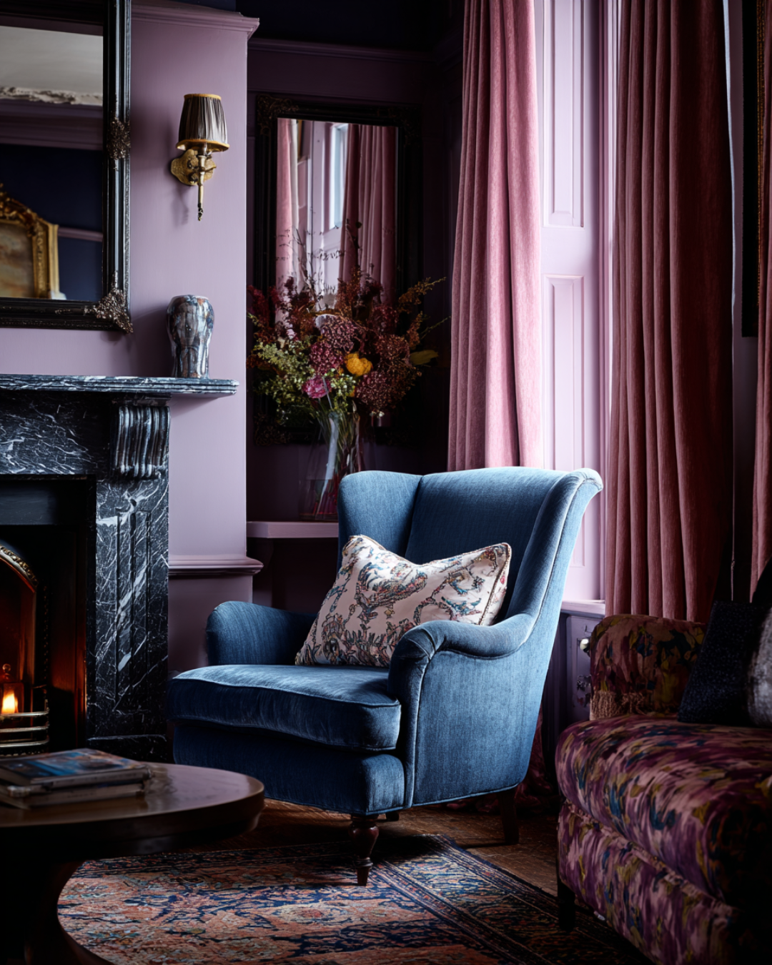 Classic living space with a soft blue armchair, blush accents, lavender walls, and floral details, reflecting elegant and timeless colour trends for 2026 interiors.
