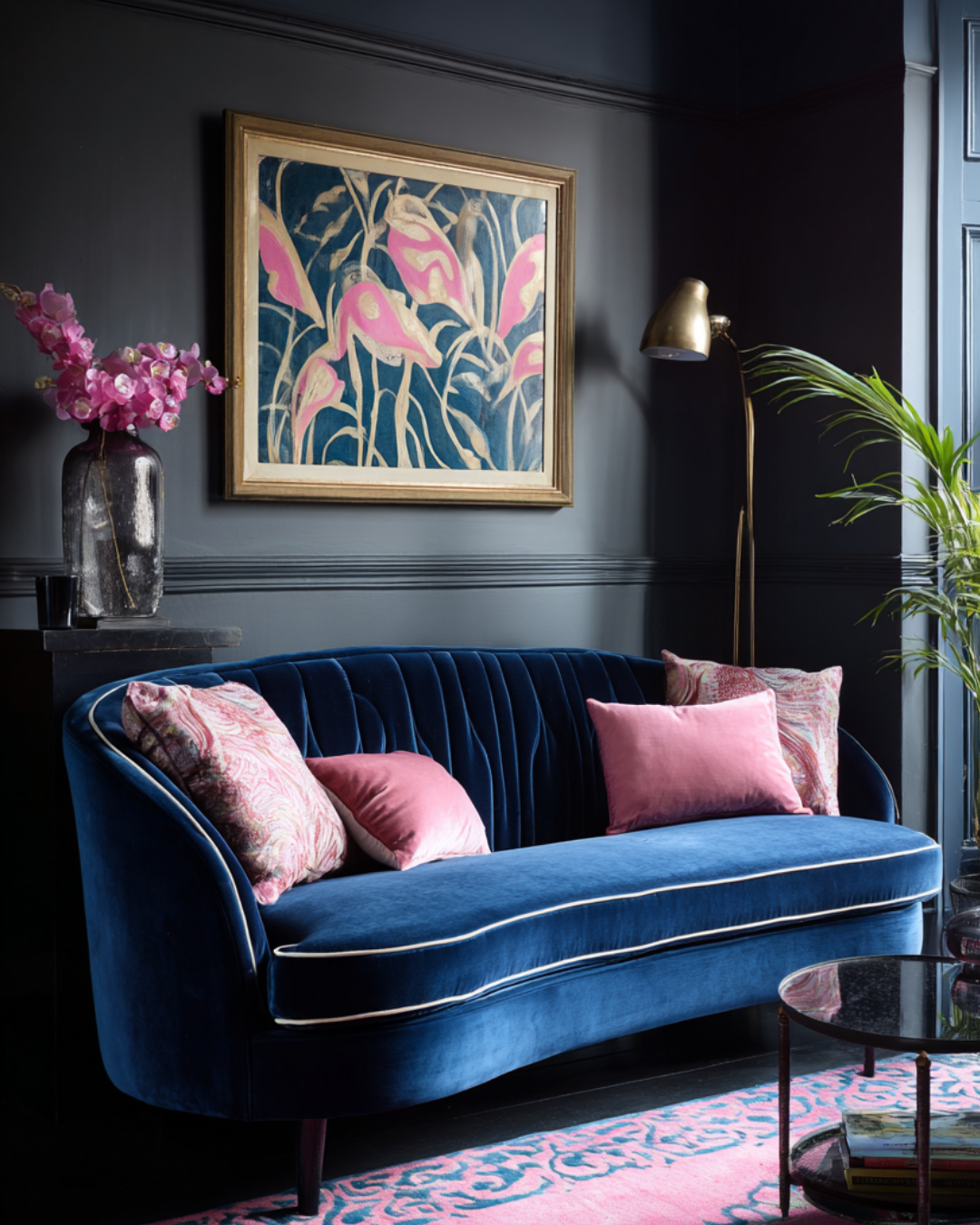 Sophisticated living room with a sapphire blue sofa, pink cushions, charcoal walls, and brass lighting, representing bold yet elegant interior colour trends of 2026.